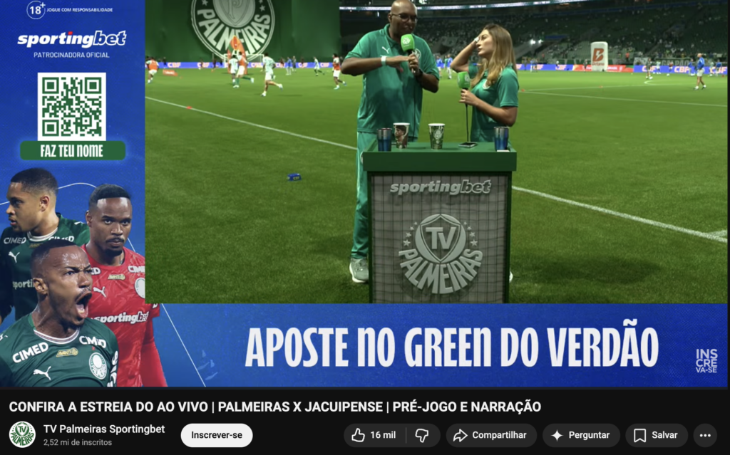 “Este é mais um passo que damos dentro desta parceria extremamente positiva. Estamos alinhados em proporcionar sempre a melhor experiência para o torcedor palmeirense, e estar presente desde o pré-jogo, que é um ótimo termômetro para sentir como vai ser a partida, fortalece ainda mais essa conexão. É um cenário ideal para estrearmos este novo formato, com grandes nomes envolvidos e ampliando ainda mais a nossa parceria”, afirmou Paula Carvalho, gerente de marketing da Sportingbet.