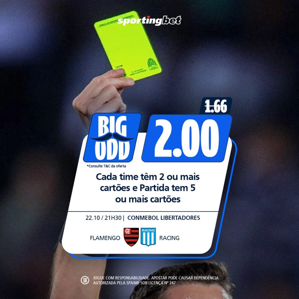 - BIG ODD: cada time tem 2 ou mais cartões + partida tem 5 ou mais cartões | Odd: 2.00